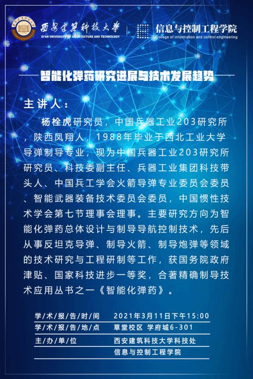 报告人简介: 杨栓虎研究员,中国兵器工业203研究所,陕西凤翔人,1988年毕业于西北工业大学导弹制导专业,现为中国兵器工业203研究所研究员、科技委副主任、兵器工业集团科技带头人、中国兵工学会火箭导弹专业委员会委员、智能武器装备技术委员会委员,中国惯性技术学会第七届理事会理事。主要研究方向为智能化弹药总体设计与制导导航控制技术,先后从事反坦克导弹、制导火箭、制导炮弹等领域的技术研究与工程研制等工作,获国务院政府津贴、国家科技进步一等奖,合著精确制导技术应用丛书之一《智能化弹药》。