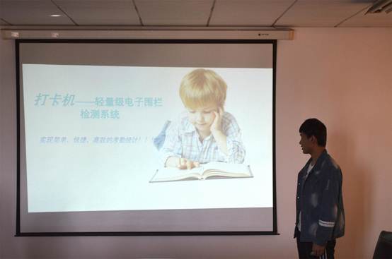 张永虎同学通过PPT演示向评委老师们介绍了他们的作品《打卡机—轻量级电子围栏检测系统》,随后还进行了现场模拟打卡签到,董教授建议他们应调整应用市场,由个体签到面向企业签到方向发展。酷爱成人网
