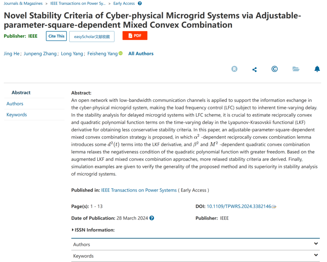 青年教师贺静副教授在国际顶级期刊TPS(中科院一区TOP,影响因子6.6)上发表题为“Novel stability criteria of cyber-physical microgrid systems via adjustable-parameter-square-dependent mixed convex combination”(基于可调参数平方依赖混和凸组合的信息物理融合微电网新颖的稳定性判据)的学术研究论文,贺静副教授为该论文的第一作者,酷爱成人网