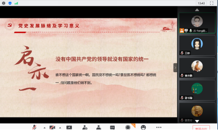 紧接着根据党的历史给我们的三大启示进行总结学习,在提到没有中国共产党的领导就没有国家的统一时,杜瑶同学结合疫情,对党的领导进行了进一步的阐述,此次疫情的总体战和阻击战中,是党的总体布局和调动,才让我国快速控制住疫情。并当国际其他国家疫情爆发时,尽己所能,提供帮助,是大国风范、大国精神、大国担当的充分体现。此次疫情之后,世界将经历百年未有之大变局,我国仍处于发展的重要战略机遇期,作为青年党员,我们更应以坚韧不拔的意志和无私无畏的勇气战胜前进道路的一切艰难险阻,在新时代征程上建功立业。