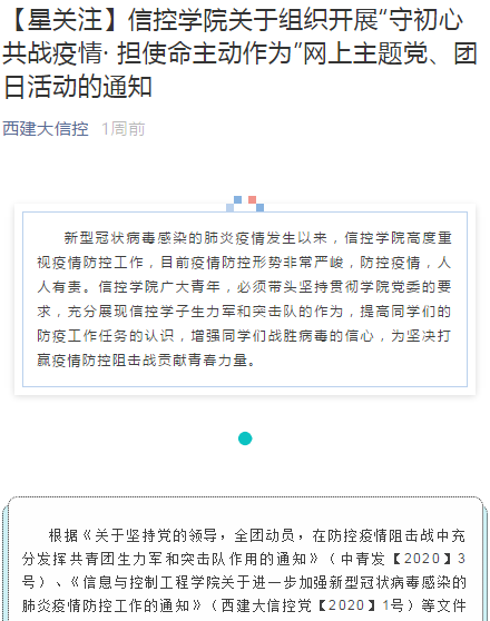 关于进一步加强新型冠状病毒感染的肺炎疫情防控工作的通知》,学生党员充分认识到疫情防控工作的重要性和复杂性,同时带头构建完善的线上服务制度,帮助教职工和学生解决困难。各学生党支部积极开展“守初心共战疫情·担使命主动作为”网上主题党日活动,带头为广大师生科普防疫知识、为疫区同胞写下祝福感悟、营造良好的自主学习氛围,增强了大家战胜疫情的信心,充分展现学生党员的作为。