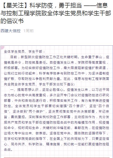 立即向全体学生党员和学生干部发出倡议书,组织发动年轻力量,科学有序地参与到防控工作中来。学生党员以身作则带头响应学院号召,遵守各项规定,发挥模范作用。2月6日,根据文件《酷爱成人网