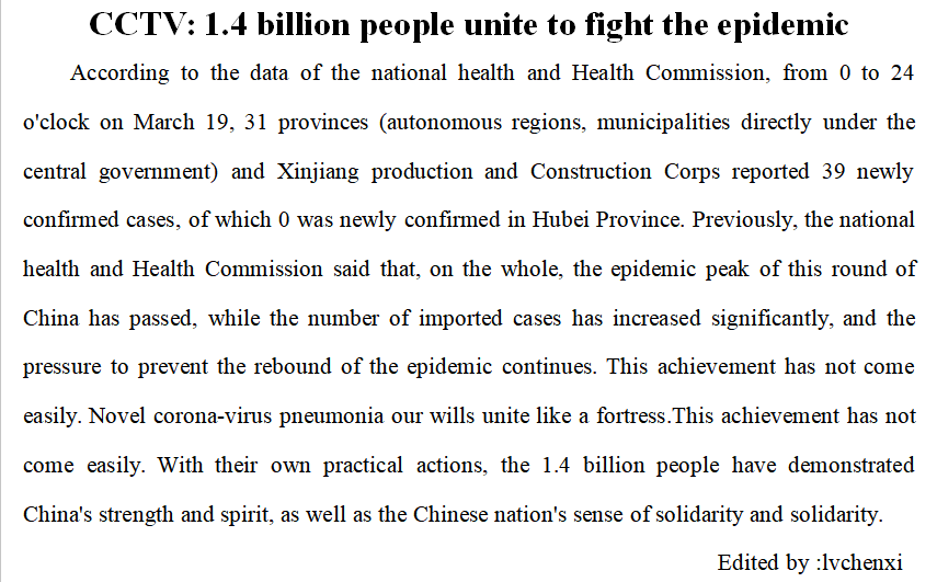 据国家卫健委数据,3月19日0—24时,31个省(自治区、直辖市)和新疆生产建设兵团报告新增确诊病例39例,其中湖北新增确诊病例0例。此前,国家卫健委表示:总体上,我国本轮疫情流行高峰已经过去,同时境外输入性病例明显增多,防范疫情反弹压力持续存在。这一成果的取得,来之不易。新冠肺炎疫情发生以来,全国人民在党中央坚强领导下众志成城、齐心协力战疫情。这一成果的取得,来之不易。14亿人民用自己的实际行动,展现了中国力量、中国精神,彰显了中华民族同舟共济、守望相助的家国情怀。