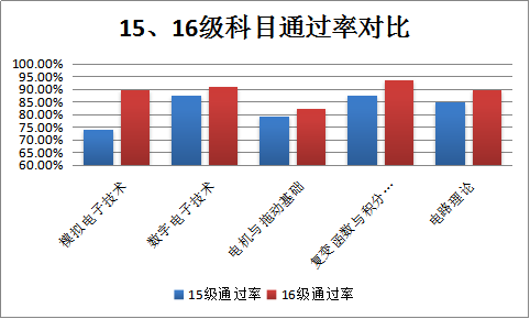 2017-2018学年的模拟电子技术基础考试人数共320人,挂科人数同比从55%下降到10%,同比降低75%,智能1601、1602班级无一人挂科;数字电子技术基础考试人数共320人,挂科人数28人,挂科率8.75%,电子1602班无一人挂科;复变函数,参考人数384人,挂科人数25人,挂科率从10%下降到6%,挂科率同比下降40%;电拖参考人数384人,挂科人数34人,挂科率从20%下降到17%,挂科率同比下降15%。