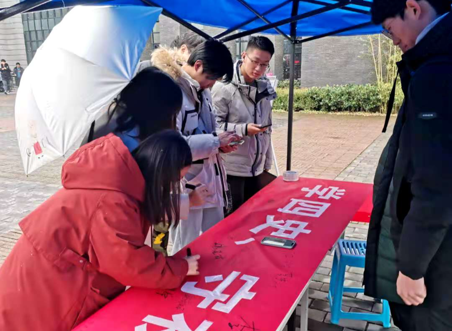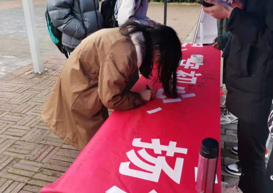 伴随着一二九活动共同前来的还有期末考试周,前来参与活动的同学们自愿在横幅上面签字,承诺自己愿意学习诚信精神,愿意诚信应考。