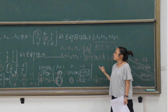陈雨航同学首先将自己复印的线性代数笔记让大家传阅,她为在座的同学讲解选填题目,主要讲解了有关矩阵的问题和解法、矩阵的特征值和标准形,行列式的解法、代数余子式和初等行列式变换。她结合老师所讲的解题方法再结合自己的理解,以作业题的形式向大家讲解了基础知识点。在短暂的休息之后,常朝然同学为大家讲解线性方程组的解法,他结合书本例题向大家仔细的讲解了不同题目的不同解法。同学们仔细听讲,不时在笔记本上记录,在本次微课堂的最后,同学们针对自己不懂的问题向学霸虚心请教,学霸们也一一认真解答。
