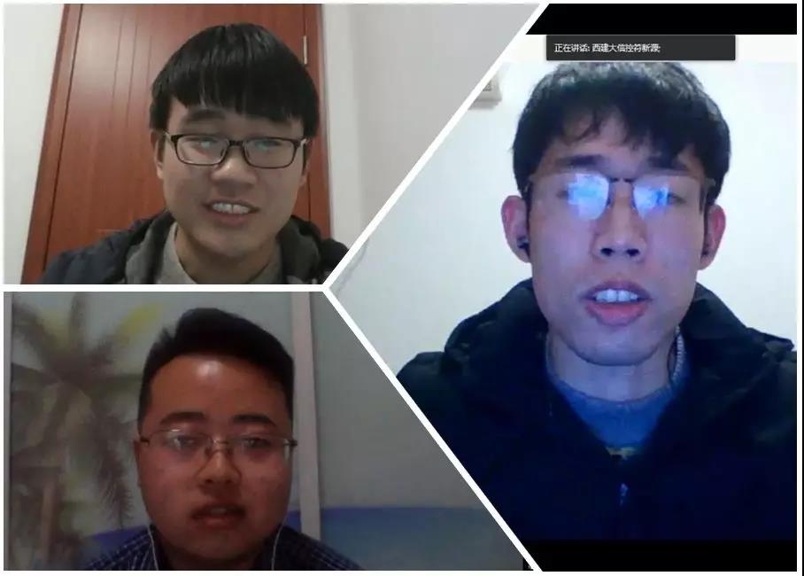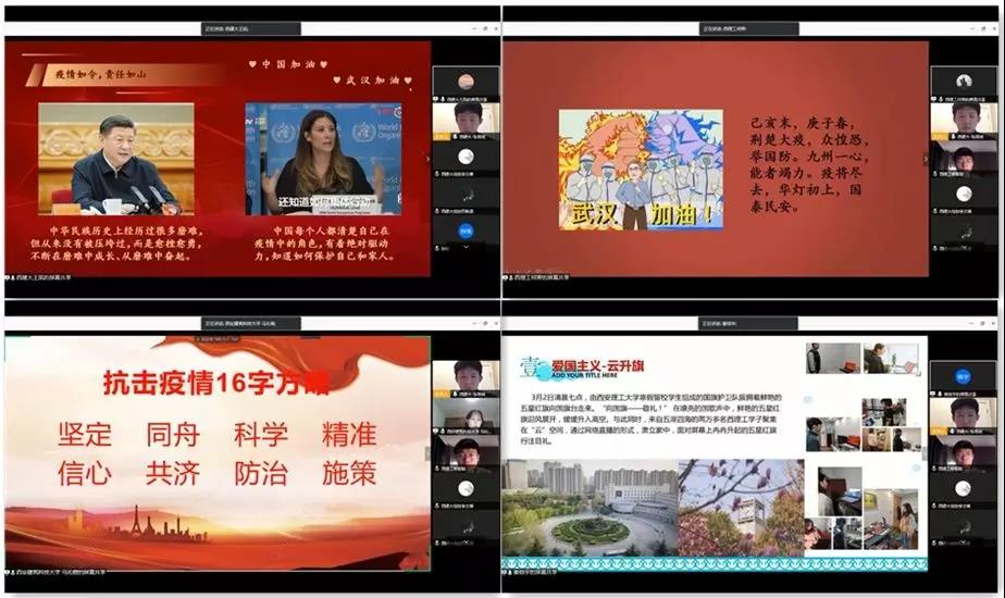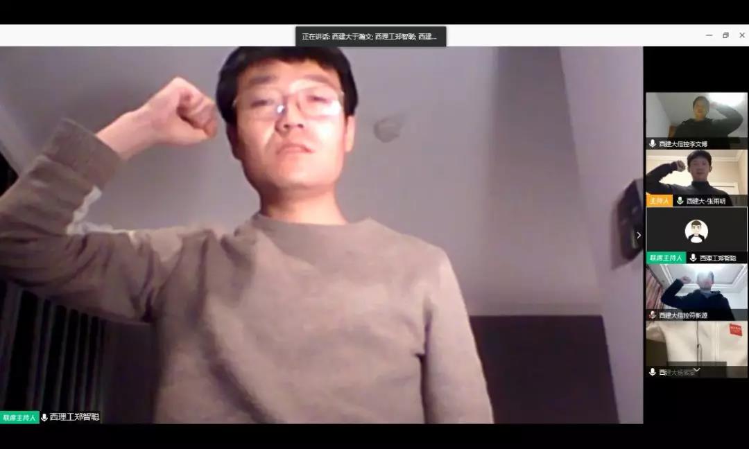 本科生第一党支部书记张雨明同志和西理工自动化学院17级本科生支部书记郑智聪同志的主持带领下,与会党员代表通过PPT演示分享交流了当天思政大课及疫情期间的感悟收获。西建大王凯同志谈到,当代学生党员应肩负起年轻人的责任,保持积极乐观心态,树立远大理想,脚踏实地充实自己,为祖国奉献自己的力量;西理工何霁表示,本次疫情既是危险也是机遇,通过这次疫情,坚持节约资源和保护环境的基本国策必将更加严格,树立践行“绿水青山就是金山银山”的理念尤为重要;西建大马沁萱谈到,疫情的防治不仅是医疗人员的战斗,更是全民的战斗,学生党员要带头服从学校关于疫情防控的相关部署和要求,以身作则,听从指挥;西理工姜信宇分享了学校“云升旗”的所见所感,两万名学生肃立家中,通过网络直播向国旗行注目礼,中国青年的爱国主义精神值得赞扬。