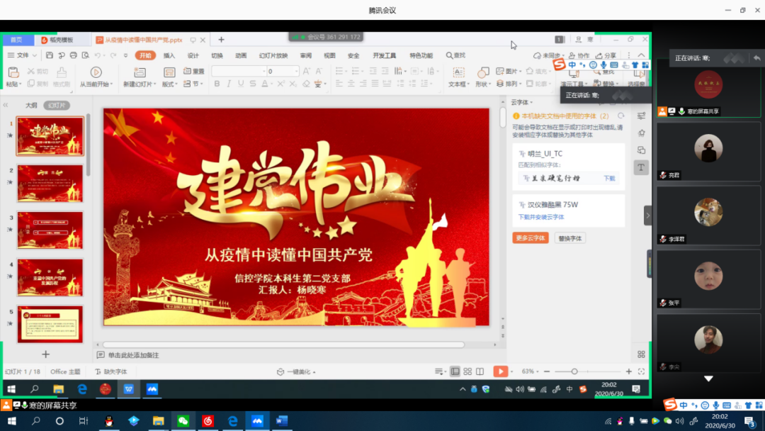 本科生第二党支部于线上开展了战“疫”专题微党课,本次党课由党支部书记杨晓寒同志进行题为“从疫情中读懂中国共产党”的党课报告。