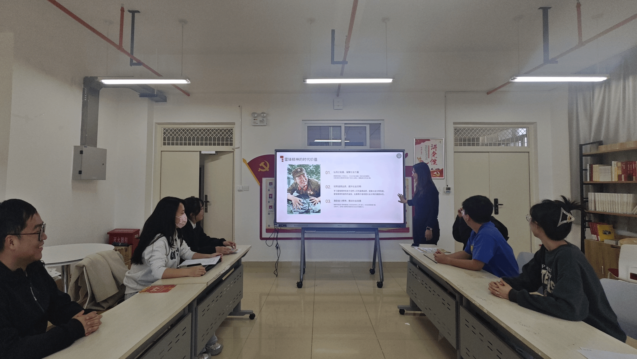 彭琪领学了习近平总书记关于开展学雷锋活动的重要指示精神,带领与会成员回顾了雷锋同志短暂而光辉的一生。他对雷锋同志的事迹进行了详细讲述,以雷锋每月仅留5角零花钱、其余全部捐献的事例,展现了雷锋同志超越时空的价值追求;通过对比雷锋同志旧社会苦难经历与新社会的成长历程,展现了信仰铸就的精神坐标。雷锋同志爱憎分明的阶级立场、公而忘私的奉献品格、言行一致的革命精神、奋不顾身的无产阶级斗志和钻研好学、艰苦朴素的“钉子”精神进一步激发了同学们对于学雷锋活动的热情和对于雷锋精神的敬仰。