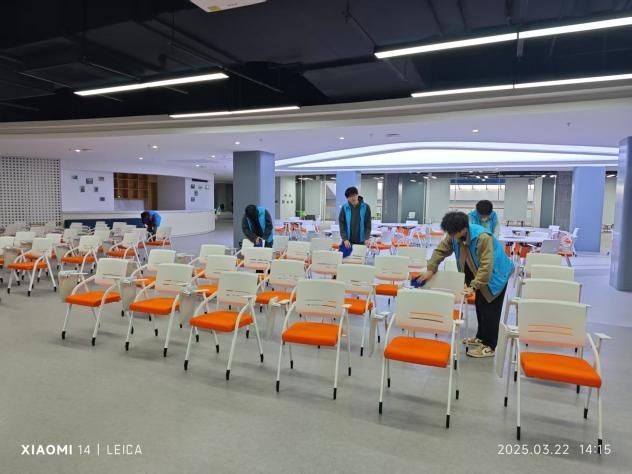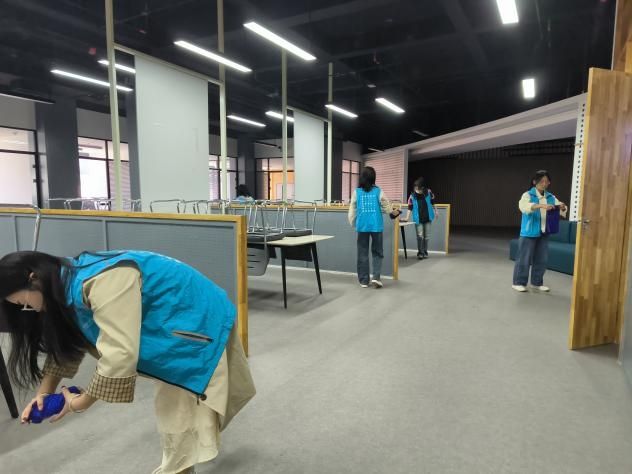 3月22日,“信”语心坊辅导站朋辈心理辅导员郝咏棋带领大一学生打扫紫阁食堂三楼。擦桌子、扫灰尘、拖地,同学们在劳动中释放压力,并表示:“擦桌子时要顺着木纹方向,就像梳理杂乱的思绪。盯着错题时总感觉大脑像蒙了层灰,现在擦净了桌子,心里也透亮了。”2小时的劳动,最终整个广场焕然一新。朋辈心理辅导员郝咏棋表示,这种 “身体劳动 + 情绪表达”的创新形式,吸引了众多低年级学生参与。