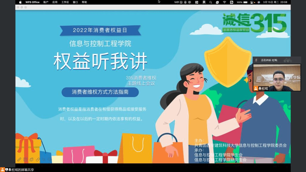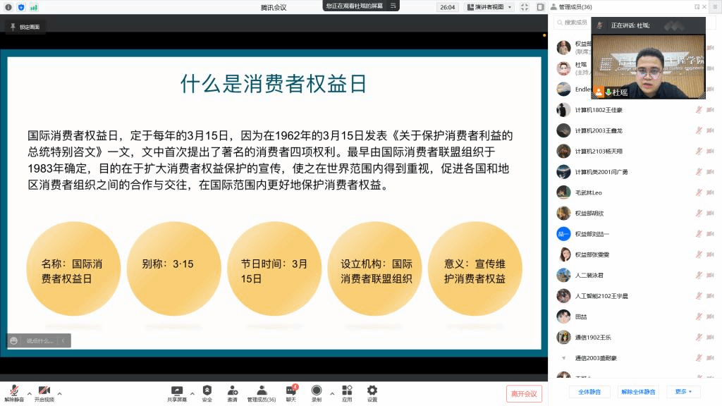 本次线上讲座的顺利举办,不仅有利于增进同学们对维权知识的了解,增强防范意识,更好地享受校园生活,还有利于增强同学们作为公民的责任感与使命感,勇敢地捍卫自身权益、与不法分子斗争到底,为国家的法制建设与诚信建设贡献一份力量。