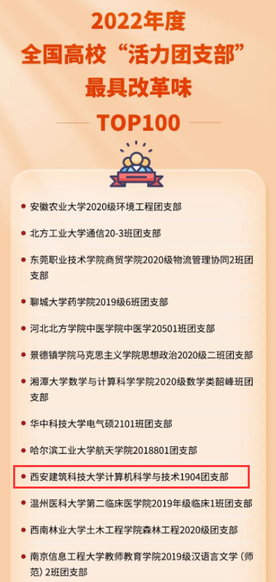 计算机科学与技术1904团支部入选,也是陕西高校唯一入选最具改革味模块前十的基层团组织。