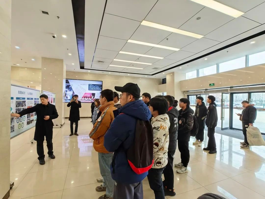 在参观学习之后,陕汽岗位与人才管理室负责人员与同学们进行交流座谈,负责人员详细介绍集团基本情况及招聘政策,同学们就企业实习、招聘就业等政策积极交流咨询。