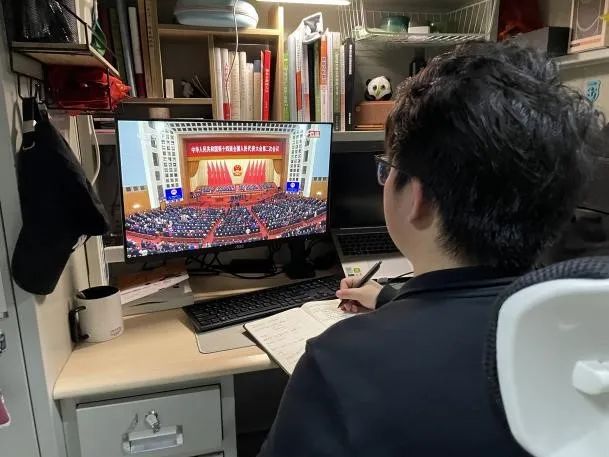 学生会全体成员通过线上线下相结合的方式观看全国两会开幕式直播,共同学习两会精神,并就政府工作报告展开热烈讨论,表达了青年一代对国家发展蓝图的向往和对社会进步的不懈追求。