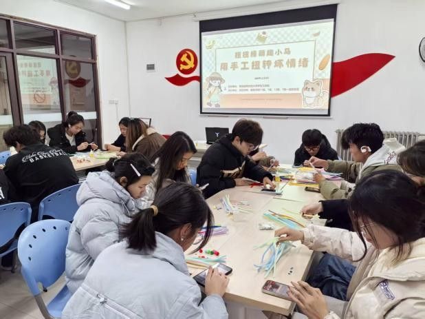 活动以一段轻慢舒缓的音乐帮助同学们清空思绪,放下考试焦虑,快速进入专注当下的状态,这一环节契合了心理疏导中“情绪锚定”的基础要求,帮助学生实现身心初步放松。随后通过扭扭棒制作教学视频,详细讲解弯曲、扭折、连接等关键手法,为零基础的同学扫清创作障碍。在悠扬的旋律中,同学们自主挑选心仪的扭扭棒颜色,通过缠绕、揉捏、扭转等动手操作,在沉浸式创作中释放内心压力,将备考阶段的焦虑情绪转化为手工创作的动力,亲手“编辑”出独属于自己的萌趣小马,打造了专属于个人的“情绪扭扭乐”。创作过程中,大家还会轻声交流制作心得,让言语互动与手工实践共同成为情绪释放与疏导的有效载体。