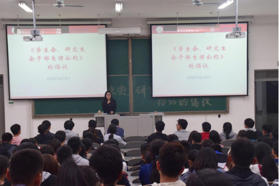 会上,2016级辅导员郝鑫带领全体学生干部就《公约》展开逐条学习,讲到学生组织是广大学生中的先进组织,始终秉承“自我管理、自我教育、自我服务、自我监督”宗旨,理应起到先锋模范作用,在学习、工作和生活中树立榜样,不应当以势压人,而应该处处以身作则,传播正能量,来影响和感召同学们,在日常学习、课堂纪律、课外活动等各方面起到带头作用。