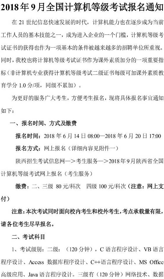 2018年9月全国计算机等级考试报名通知