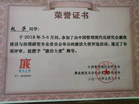 清源学社在2017年12.9全国大学生廉洁教育月中荣获“优秀组织奖”。廉政学会副会长、湖南大学廉政研究中心执行主任袁柏顺教授宣读了2017年12.9全国大学生廉洁教育活动月表彰决定。南昌大学党委书记喻晓社等领导出席夏令营开营仪式,南昌纪委书记黄云主持开营仪式。出席活动的各位领导、嘉宾和辅导老师向廉洁大使颁发了徽章和证书。