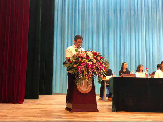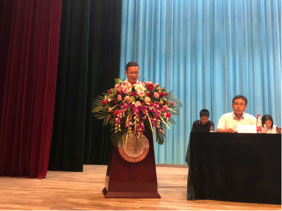 在庄严肃穆的国歌声后,段中兴院长代表学院致辞。他表达了对来自五湖四海的新生们的真诚祝贺和热烈欢迎,随后向大家详细讲解了学校的建校历史、学院的专业构成和师资力量。段院长告诫同学们:国无德不兴,人无德不立,希望同学们进入大学要德学兼备,要通过生活的自觉自主走向人生的自立自强,求真务实,要具有社会责任感,为自己的大学生活谱写出华丽的青春之歌。最后他祝愿同学们的大学生活充实精彩。