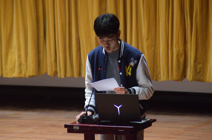大会伊始,杨朋于向同学们分享了党史小故事《毛泽东与他的拐杖情缘》,通过这个故事意在告诉同学们从一个人平时的作风,就能反应一个人的品质,希望同学们积极学习毛泽东同志的精神,在建党一百年的历史节点,争做时代新人。