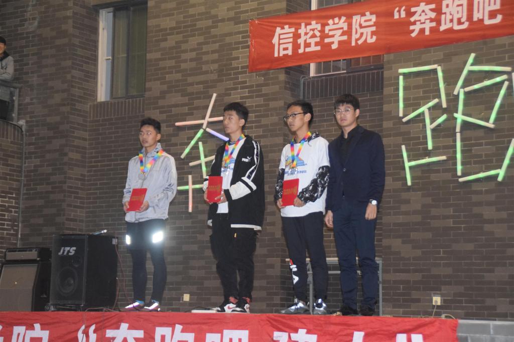 学生韩东东以高达80公里的奔跑里程数荣获本次活动的一等奖。随后由杨晓寒、王栋、张雨明依次为获奖同学颁发证书、奖杯或奖章并合影留念。