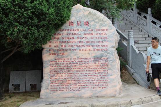 在队长的带领下,队员们开始了行程,初登宝塔,映入眼帘的不是从远处看去一座普通的塔,而是充满的古朴与萧瑟,令人敬畏。往山下望去,延安城景色尽收眼底,旁边旅游团的导游在一旁讲解着宝塔的来历,说到一句“登泰山而一览众山小,登宝塔而一览延安城”将此时场景尽现。塔旁有一洪钟,称明代铁制洪钟,用于革命时期的报时与报警。之后团队继续自己的行程,踩着一层又一层的台阶,路途旁各式各样的树木交替种植,令人仿佛身处于绿色天堂。路边的仿制树洞播放着一首又一首的红歌,熙熙攘攘的人群中有许多穿着红军衣裳的游客,走在路上,就好像置身于革命时代,令人久久难以忘怀。之后队员们登上了摘星楼,领略了一次“高处不胜寒”,下方的少许窑洞,也有着革命时期的影子。队员们穿过丛林小道,参观了嘉岭书院的碑文,登上了烽火台,感受了下古代战争的氛围。队员们在每处都有着合影与留念。