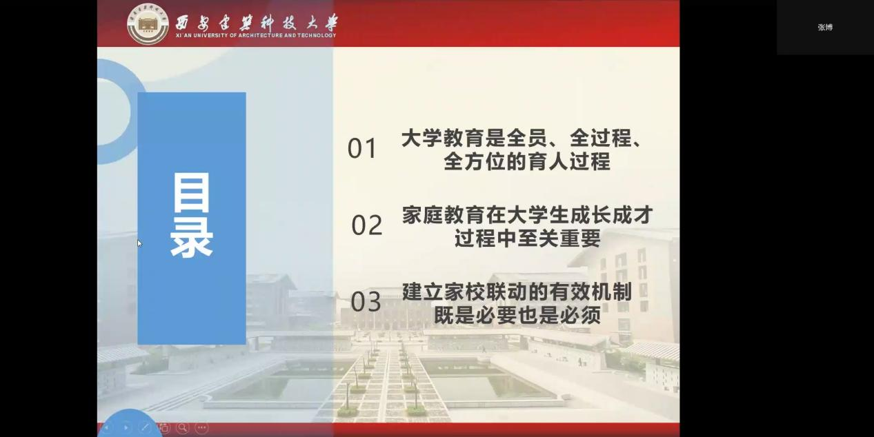 院党委副书记、副院长张博从学生日常事务管理、大一学风、心理健康、双创教育等方面进行介绍,重点围绕家庭教育的重要作用和构筑家校联动必要性两个方面与家长朋友们进行了深入交流,对如何建立家校联动机制的具体做法做了介绍,获得家长的一直认可。