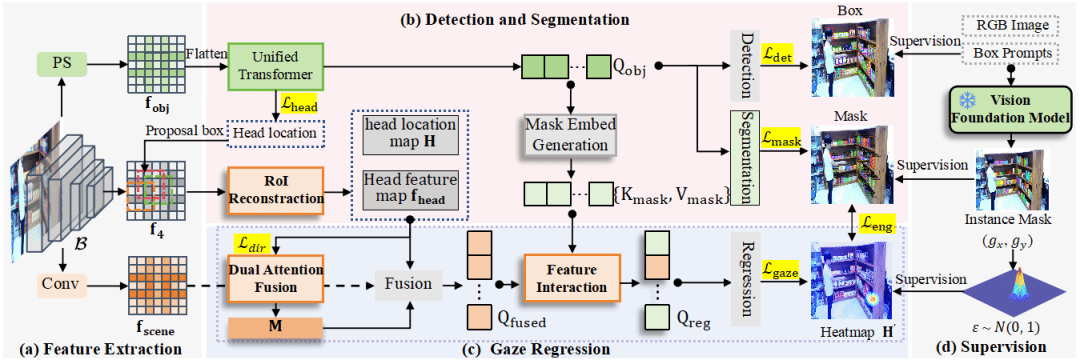 针对此问题,论文引入了视觉基础模型以提供像素级监督,并提出了挑战性的凝视物体分割任务。该任务旨在精确识别并提取出被人类凝视行为锁定的物体的像素级掩码,从而构建出语义清晰、边界明确的表征。论文设计了一个端到端的一体化凝视物体检测与分割框架,该框架不依赖额外的头部输入,能够并行地处理凝视估计、目标检测及实例分割三大任务。此外,论文还提出一种空间到物体的凝视回归方法来增强检测分支和凝视分支之间的交互,逐步提升人—物凝视关系的建模,从而实现清晰的凝视定位。在GOO-Synth和GOO-Real数据集上的大量实验证明了提出方法的有效性。