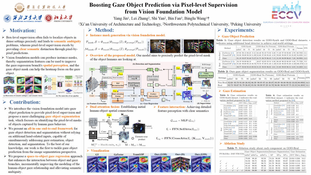 硕士研究生靳杨在国际顶级会议ECCV上发表题为“ Boosting Gaze Object Prediction via Pixel-level Supervision from Vision Foundation Model ”(基于视觉基础模型的像素级监督增强的凝视物体预测)的学术研究论文。靳杨为论文的第一作者,酷爱成人网