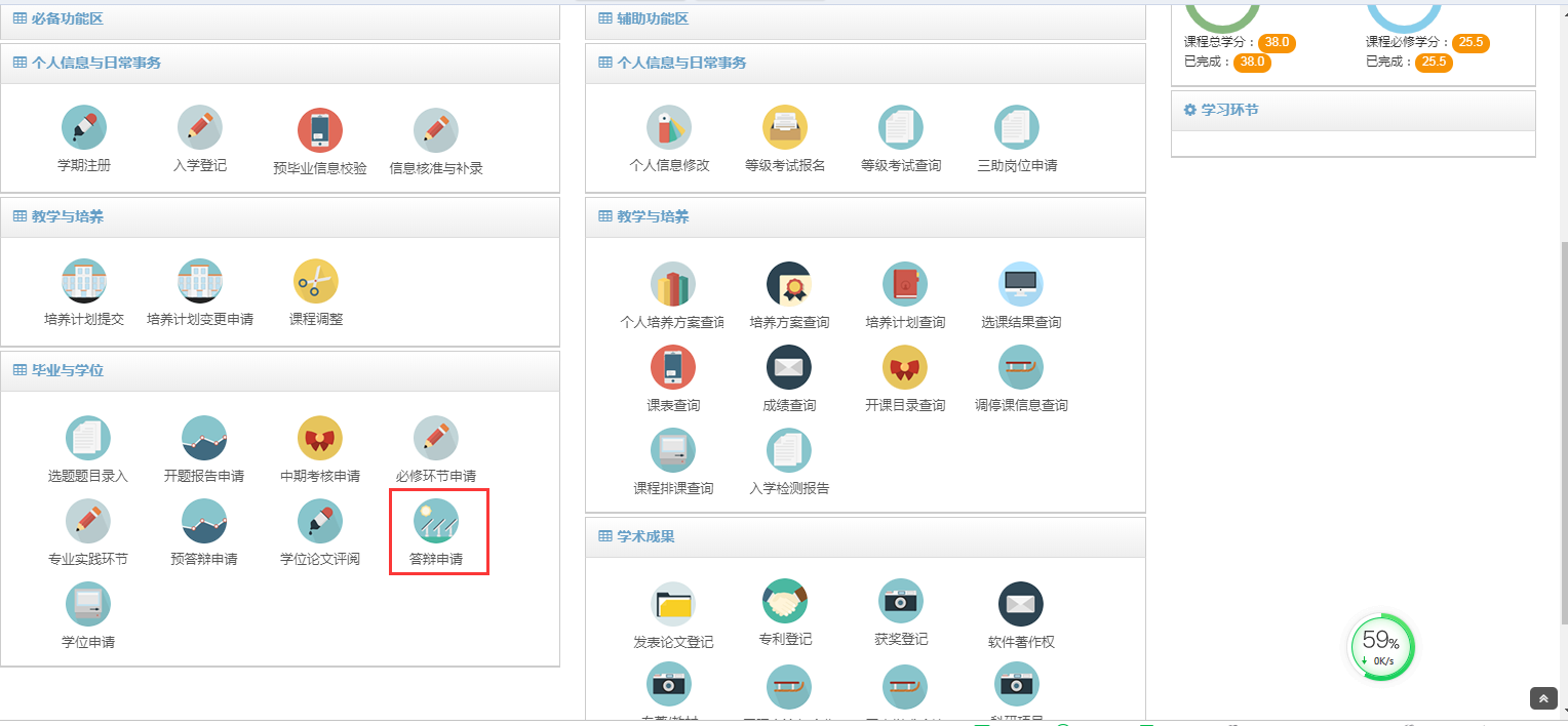 三、查看“答辩申请”功能模块,自查培养环节完成情况
