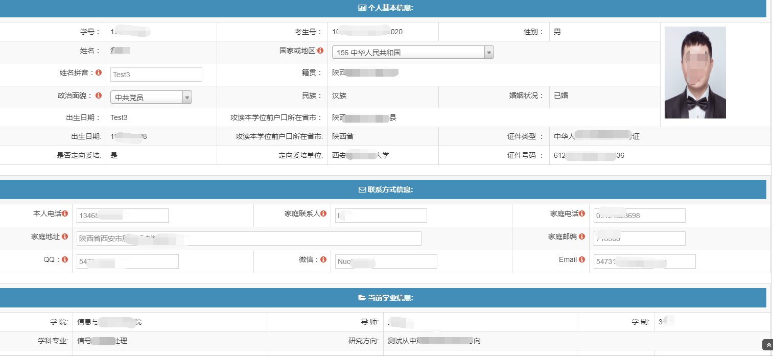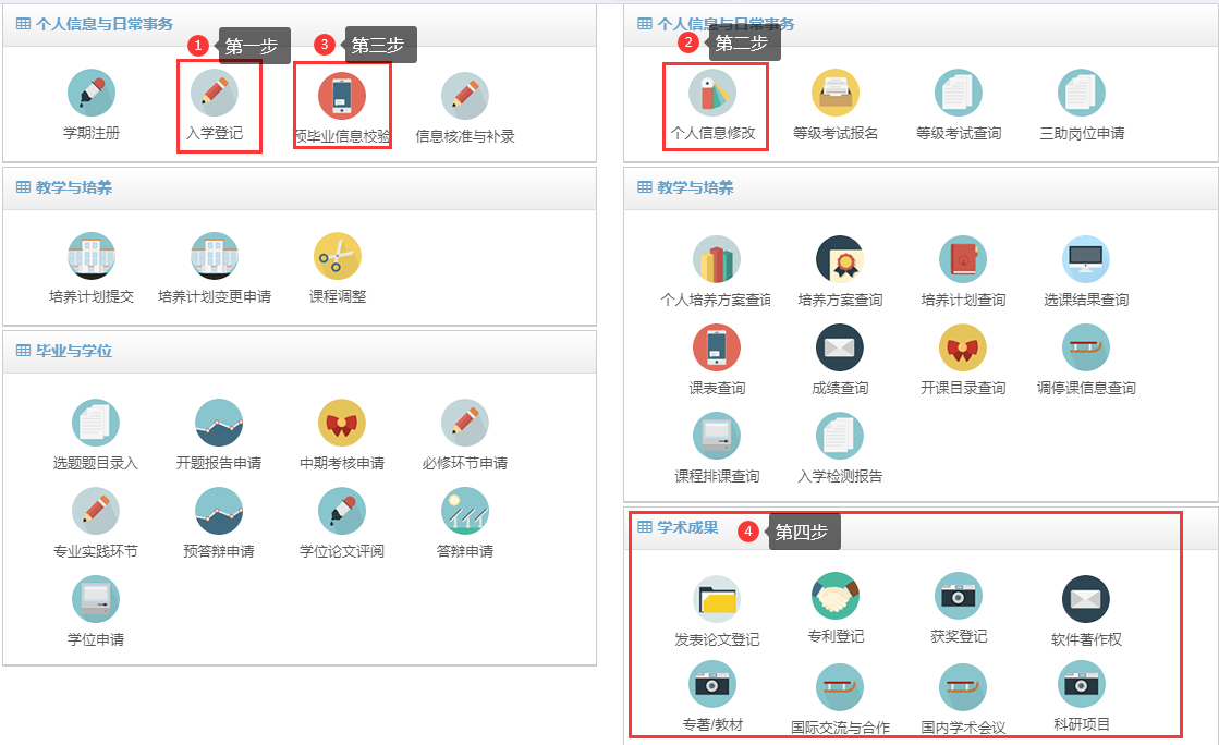 二、依次进入“入学登记”、“个人信息修改”、“预毕业信息校验”模块和“学术成果”模块完善信息。