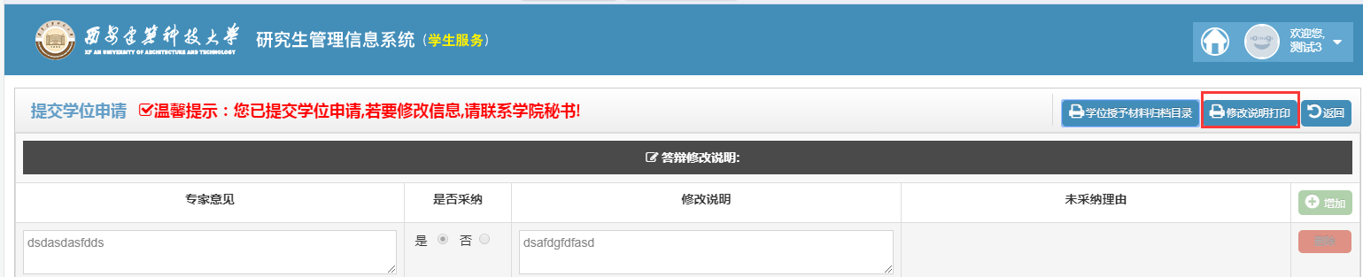 1.点击“学位申请”填写答辩修改说明