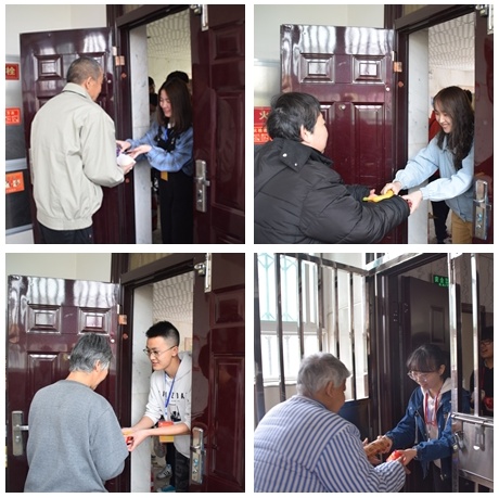 经过一个小时的车程,星火志愿队到达目的地——西安市第一社会福利院。向工作人员了解了有关情况后,志愿者们有序地进入老人们的住所,心身一区和心身二区。志愿者们向老人们分发了带来的水果、饼干等。由于老人们情况特殊,暂时不能与他们交流,因此,送完东西后,志愿者表示下次还会来看望他们,希望他们健康生活。