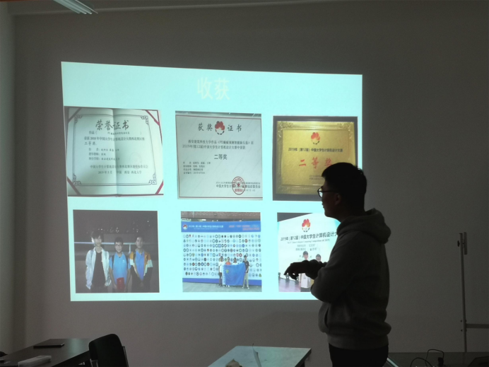 接下来,高柘铭同学也讲述了自己在比赛过程中的经验,从最初的报名、组队到中间过程中的团队协作、各司其职,再到最终老师在技术方面的指导、制作ppt和答辩,他都进行了详细说明,最后,他希望有意愿参加这个比赛的同学们能尽早考虑组队、作品等方面的问题,力争取得优异成绩。