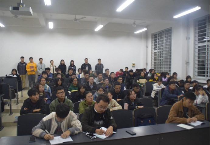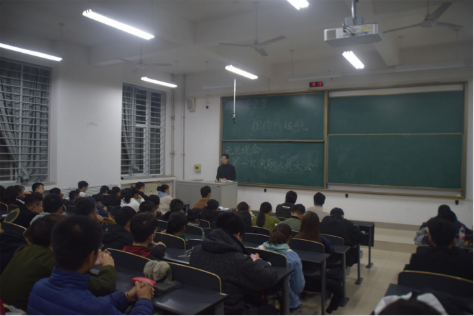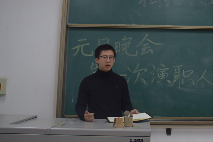 接着,张雨明上台讲话,他首先说明了此次元旦晚会的重要性,他谈到今年是全体信控师生齐聚草堂校区的一年,希望同学们能认真对待此次晚会。随后,张雨明对同学们近期的排练情况做了点评,既指出了同学们的许多优点,也点出其中的一些不足之处。接着,他对全体演职人员提出了几点希望,希望大家能够克服困难,在剩下的时间里更加处理好学习和排练的时间,认真训练。最后,张雨明指出此次晚会的优势所在——举办规模浩大,硬件设施齐全,后勤补给保障充足,同学们也是多才多艺,最后提出了16字作为总结:团结、紧张、严肃、活泼、创新、投入、坚持、耐心。