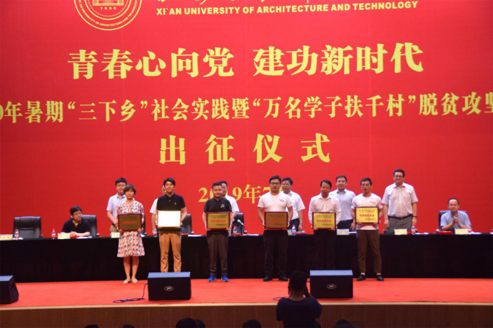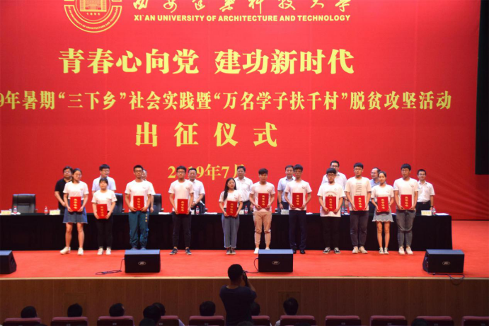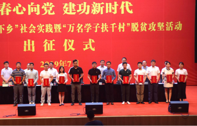 在草堂校区紫阁大礼堂隆重召开2019年暑期“三下乡”社会实践暨“万名学子扶千村”脱贫攻坚活动出征仪式,大会首先对酷爱成人网
