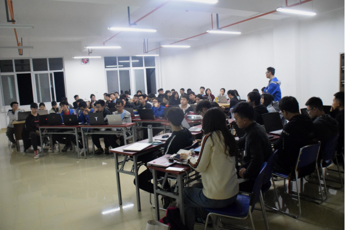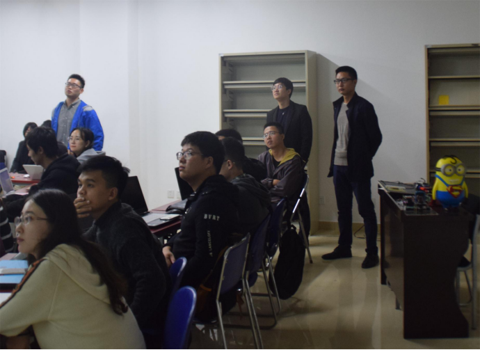 为竞赛培训的投入并进行往年竞赛成果展示,“电磁炮”、小黄人烟雾报警器、纸张数量检测仪等竞赛作品带给大家带来眼前一亮的感受,激起了大家强烈的兴趣。接着,他以STM32环境的基本搭建过程为重点,介绍了电子设计竞赛的概况,为同学们详细讲解了历年来全国大学生电子设计竞赛的赛况以及参赛对知识、能力、技术的全面要求,并以考研和就业为例,从同学们的切身利益角度分析了参赛经历的重要性。同时,他还向同学们分享比赛经验,讲述自己的竞赛历程,希望同学们能够注重团队合作意识,确立感兴趣的项目,大胆将想法融入到竞赛的作品中去,与会同学们认真听讲,积极动手实践。