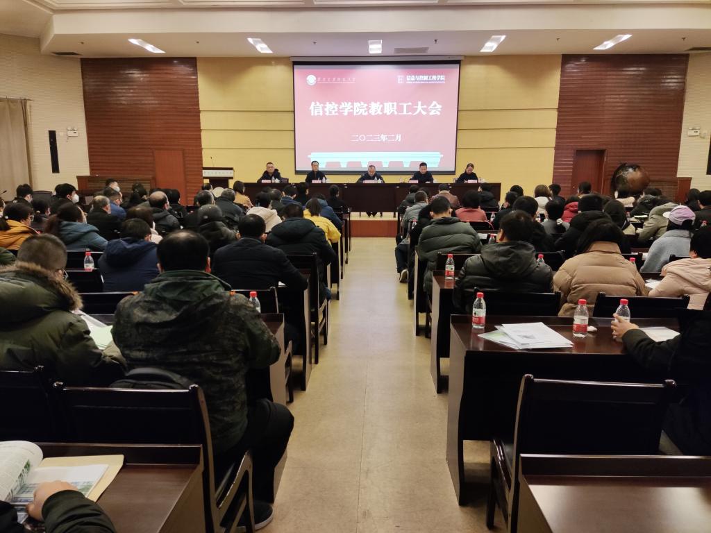 在工科楼三楼报告厅召开全体教职工大会,学习传达学校党委全委(扩大)会议精神,部署2023年党政重点工作。会议由院党委书记于军琪主持。