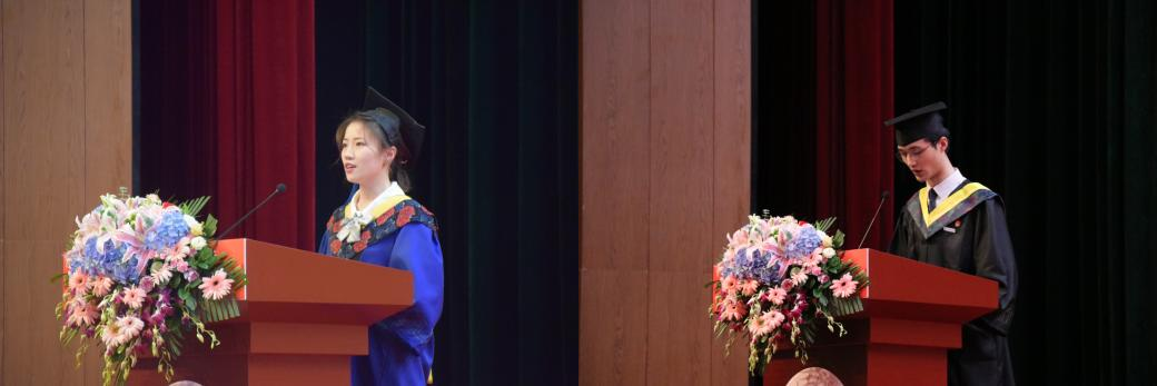 教师代表常金勇对毕业生们表达了真挚的祝福,希望全体毕业生珍惜现在和以后的每一分每一秒,将个人发展融入到中国梦的生动实践中,以实际行动为推动国家高水平科技自立自强做出更多、更实、更好的原创贡献。毕业班辅导员孙正清希望同学们牢记学校和学院对毕业生培养和期望,在以后的人生道路上努力奋斗,为家国洒热血、为真理献生命,始终堂堂正正、坦坦荡荡做人。优秀毕业生代表席文静和杨剑桥回顾大学的美好时光,并表示未来都将以“为人诚实,基础扎实,作风朴实,工作踏实”的校风要求自己,以“自强,笃实,求源,创新”的校训勉励自己,为母校争光添彩,用努力和成功来回报社会,回报母校。