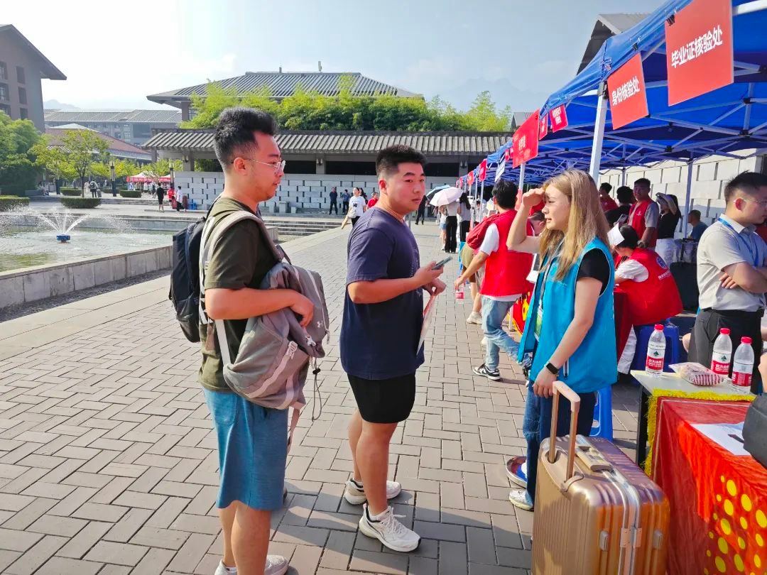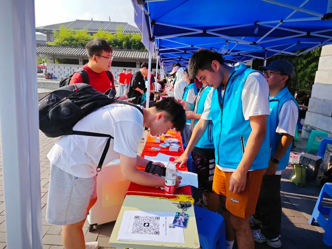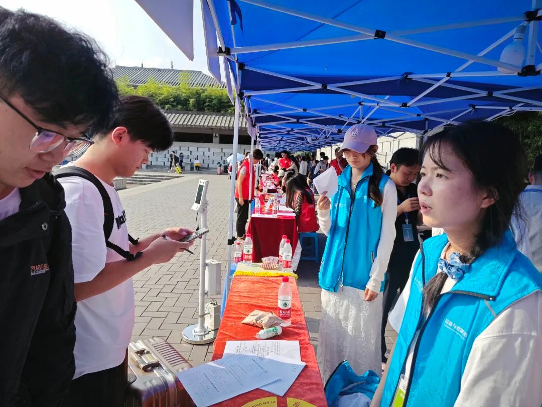迎新现场,一件件醒目的“蓝马甲”随处可见,