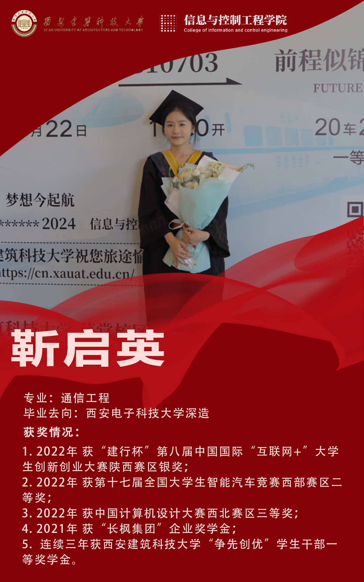 靳启英,中共党员,曾担任通信2004团支书。本科期间曾获“长枫集团”企业奖学金、“争先创优”学生一等奖等多项奖项。竞赛方面,曾获第八届中国国际“互联网+”大学生创新创业大赛陕西赛区银奖、第十七届全国大学生智能汽车竞赛西部赛区二等奖、中国计算机设计大赛西北赛区三等奖。积极推进班团工作,荣获“优秀学生干部”、”优秀共青团员“等称号。