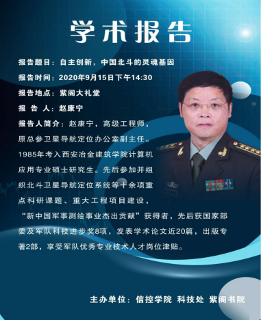 主讲人介绍:赵康宁,高级工程师,“新中国军事测绘事业杰出贡献”获得者,先后获国家部委及军队科技进步奖8项,发表学术论文近20篇,先后参加并组织北斗卫星导航定位系统等十余项重点科研课题、重大工程项目建设。