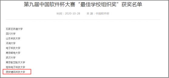 2020年11月,在工业和信息化部、教育部、江苏省人民政府主办的“中国软件杯”大学生软件设计大赛中,积极组织指导学生参赛,获得“最佳学校组织奖”,国家级三等奖1项。