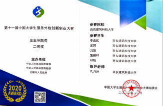 2020年8月,在由教育部、商务部和无锡市人民政府主办的中国大学生服务外包创新创业大赛中获得国家级二等奖1项、国家级三等奖1项,省部级一等奖1项、二等奖1项、三等奖2项。