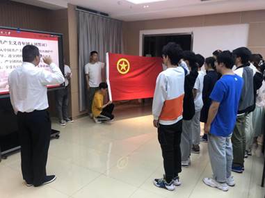 王隋德带领新团员宣誓,新团员们面向团旗立正,跟随领誓人宣读入团誓词,声声誓言,字字铿锵,代表着新团员愿为共产主义事业而奋斗终生的决心。