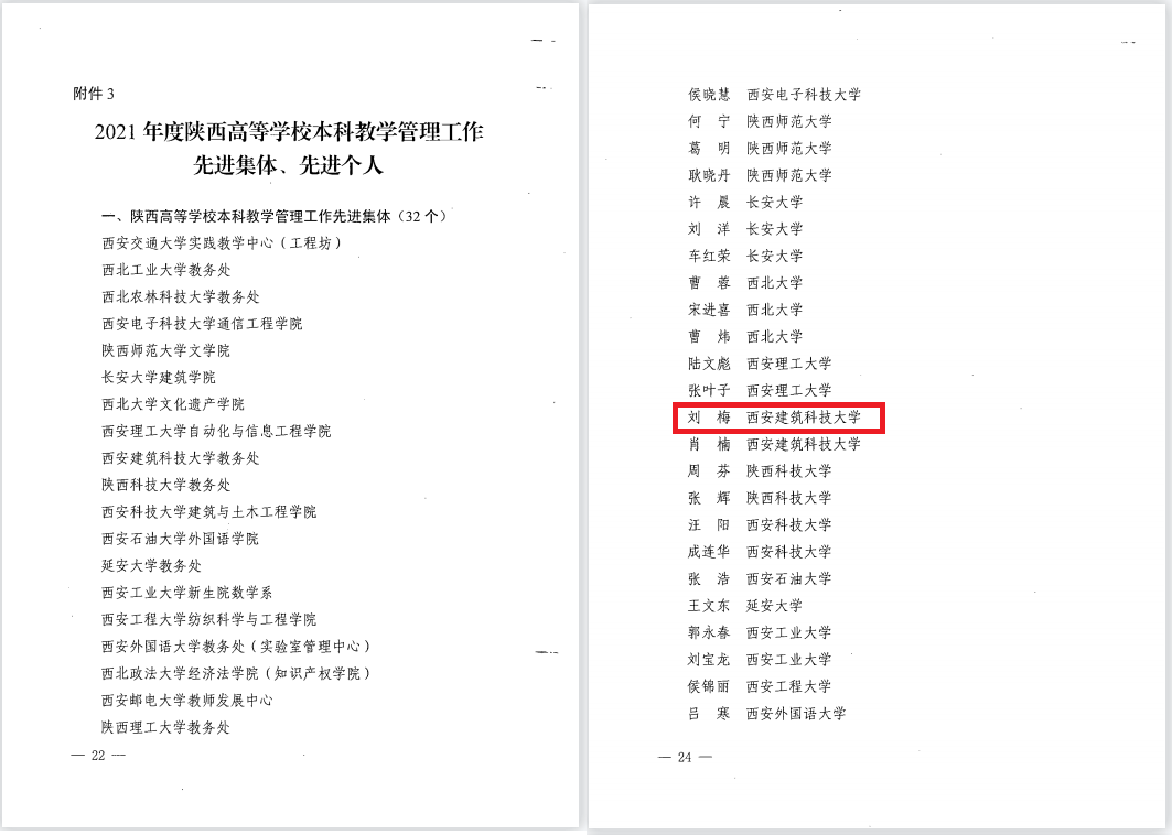 刘梅老师获评“2021年度陕西高等学校本科教学管理工作先进个人”。