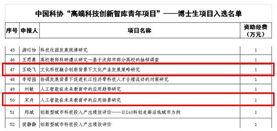 共有2个项目入选,分别是王晓飞申报的《文化科技融合创新背景下文化产业发展策略研究》和宋丹申报的《人工智能在未来教育中的应用场景研究》。