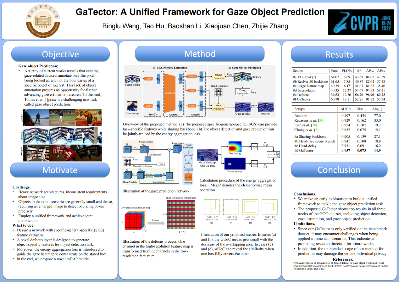 为此,论文提出了一个名为GaTector的新框架,以统一的方式解决凝视对象的预测问题。首先本文提出了一个特定-一般-特定(SGS)的特征提取器,利用一个共享的主干来提取场景和头部图像的一般特征。针对不同子网络的特殊性,SGS在共享主干之前引入了两个特定的输入处理层,在共享主干之后引入了三个不同的输出处理层。然后,本文设计了一个新颖的散焦结构,在不丢失信息且无需额外计算量的前提下为目标检测任务生成特定的物体特征。此外,框架引入了能量聚集损失,对不同的子网络完成联合优化。最后,本文提出了一个新的mDAP指标,即使不同边界框之间没有重叠的区域,它也可以揭示不同边界框之间的差异。此框架在GOO数据集上进行的大量实验验证了本文的方法在目标检测、视线估计和凝视物体预测三个任务中的优越性。